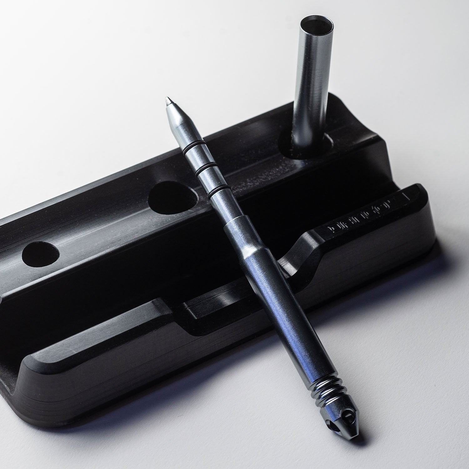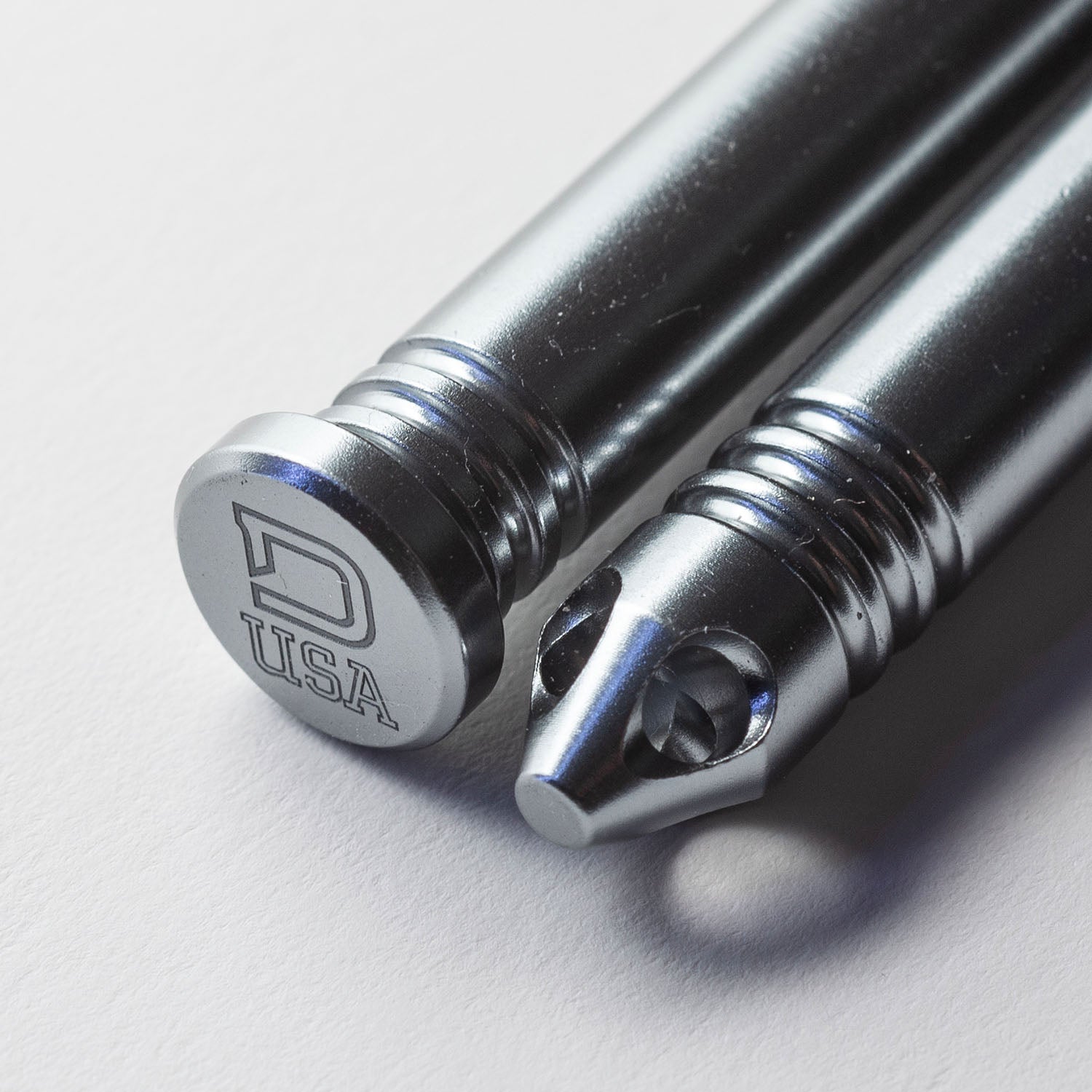 We CNC'd each pen in the USA from 6061 aerospace grade aluminum and anodized each pen to provide a durable finish. For the ink, we used the highly regarded Schmidt 4889M ball point pressurized ink refill allowing you to write upside down without any change in ink flow. (also compatible with Fisher ink refill SPR4)