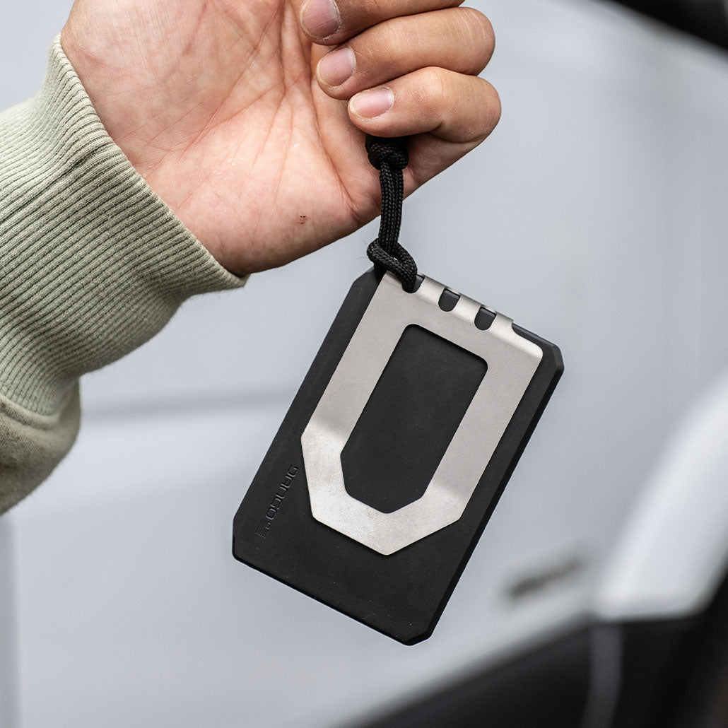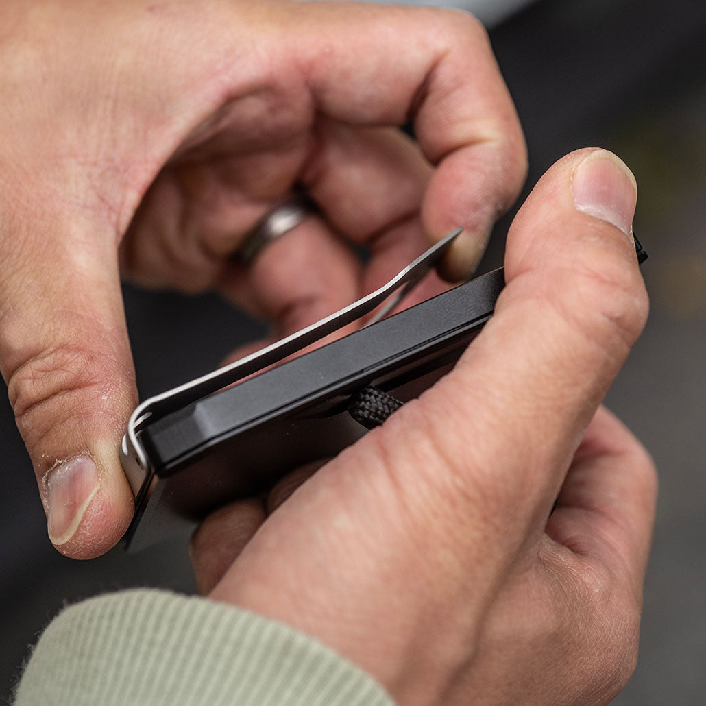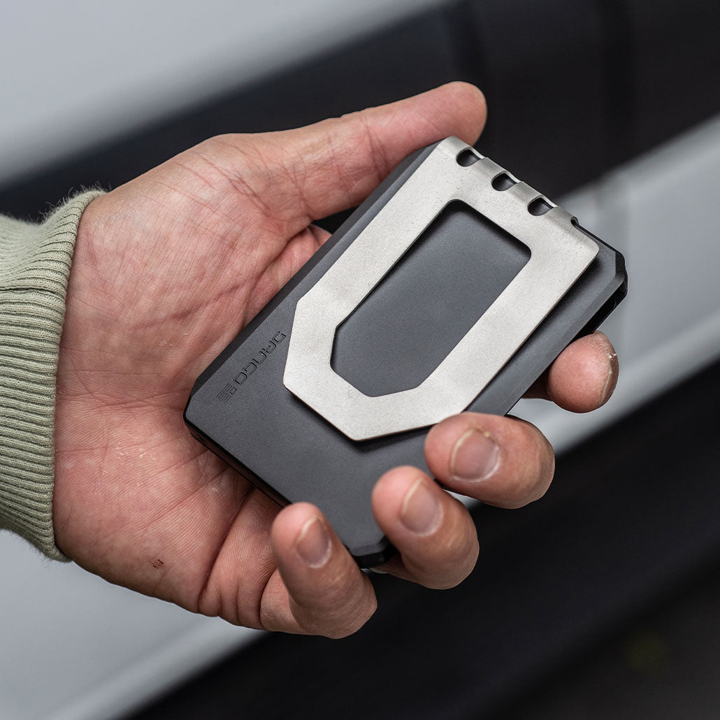 Mounted on the right side (front facing forward), it adds extra card or cash storage with a thumb notch for quick access. Built-in lanyard holes lets you attach keychains, paracord, or Dango tethers.