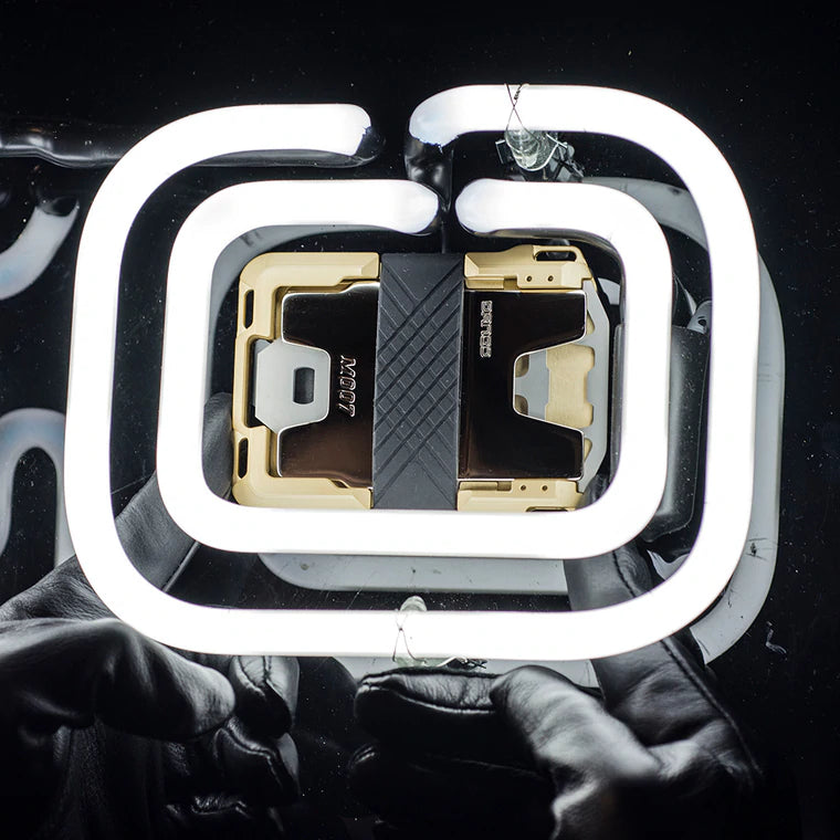 Machined out of 6061 aerospace aluminum, the chem-etched gold anodized wallet chassis has a velvet-like finish. The hand polished nickel plated backplate creates a contrast between ultra-matte and high-gloss. The combination of top grain leather, premium metals & precision craftsmanship really defines the design language of the M007 Limited Edition Wallet.